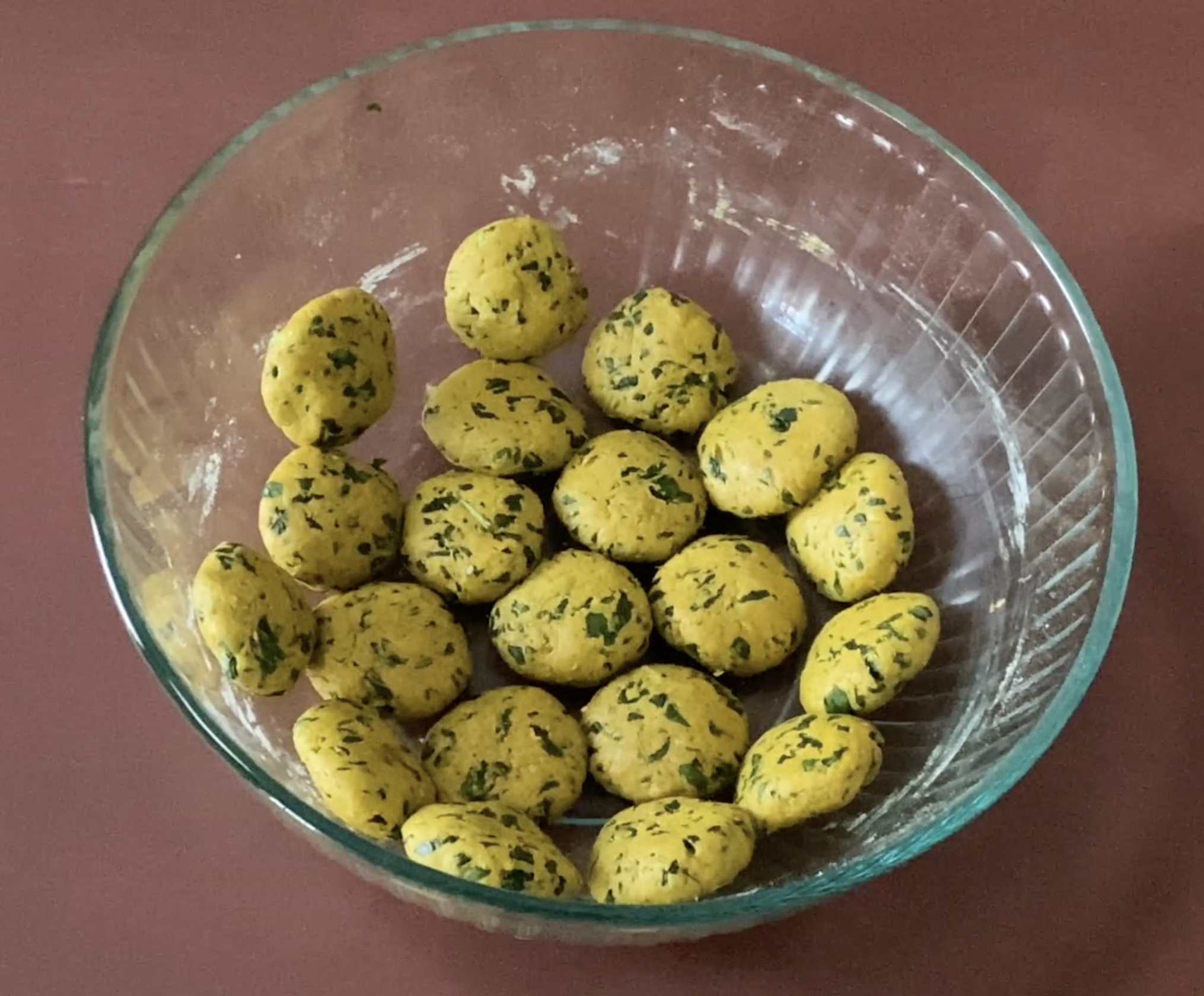 Divide the dough in around 18-20 small balls. Working on one dough ball at a time, dust a dough ball.